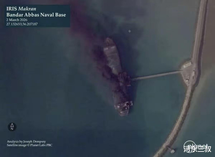 基于战时宣传目的,美军中央司令部公布对伊朗海军打击战果,确认已经摧毁伊朗11艘主力舰艇,对剩余军舰展开追杀。从卫星照片上也可以看到,港内还有几艘驱护舰以倾覆姿态躺在水中,美方说的也很直白就是要摧毁伊朗海军,目标明确这是有计划的军事行动。更何况阿巴斯港毗邻霍尔木兹海峡,也是“莫克兰”号基地船的母港,所以第一波打击锁定这里并不奇怪。